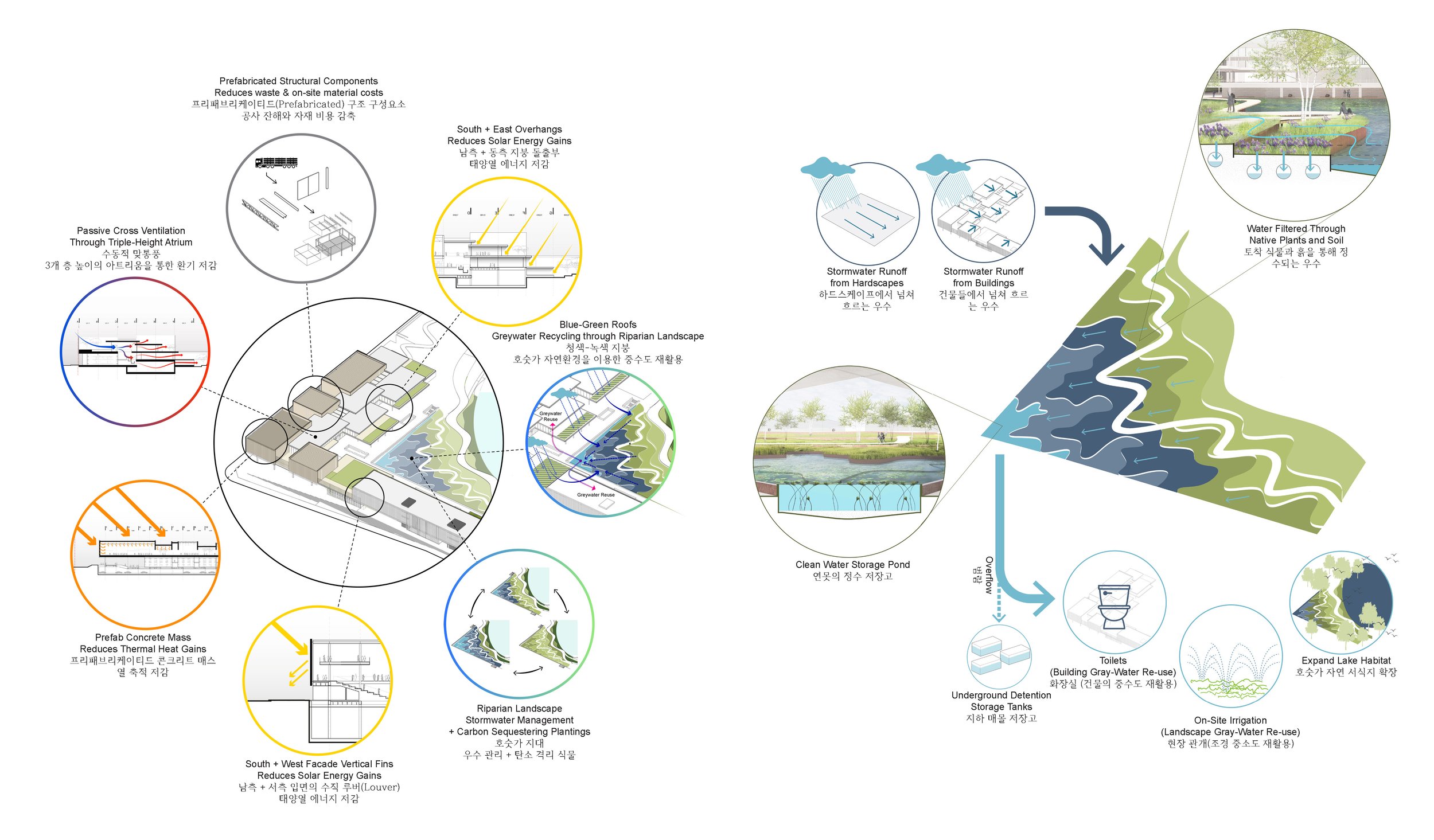 The project creates an ecology of knowledge and culture through the exchange of information between the museum, library, and the landscape. The landscape is designed both as a place for civic recreation and gathering as well as an outdoor laboratory highlighting three distinctive ecosystems found in Korea: the riparian zone, broadleaf forest, and coniferous forest.