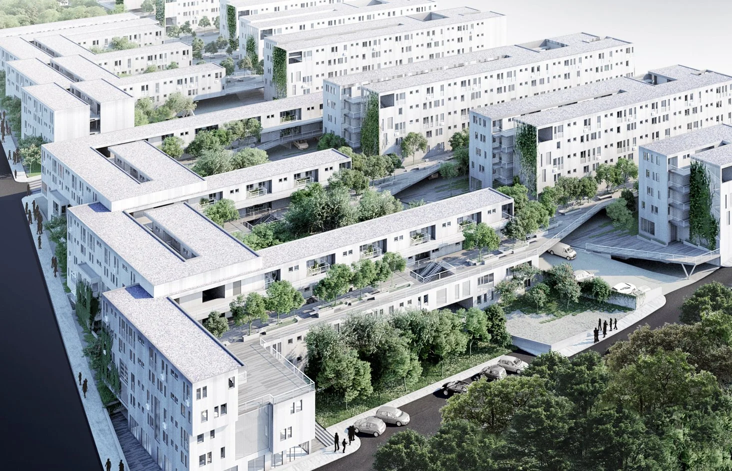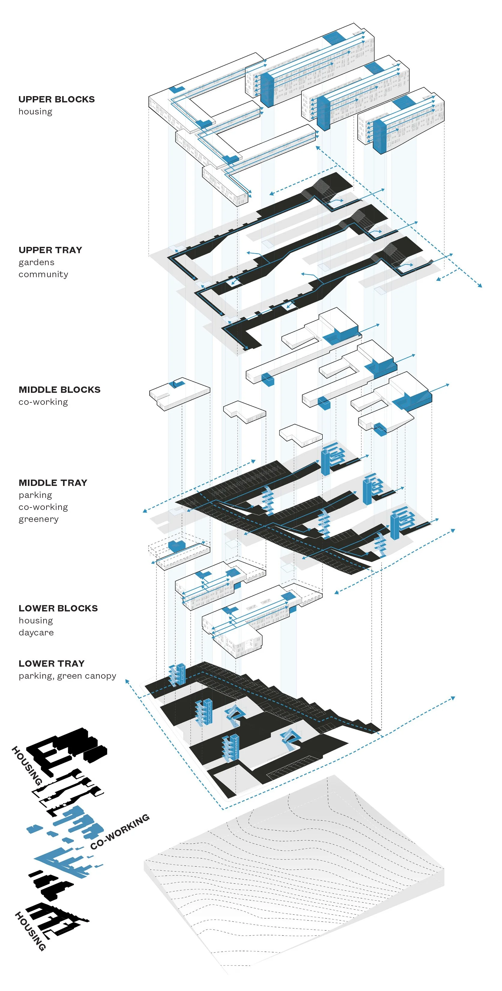 By taking advantage of the site’s topography, Gravatai Housing proposes a new low-rise, high-density housing alternative for the periphery of Porto Alegre, Brazil. Establishing a mixed-use program of living and co-working spaces, the project is organized in a series of three trays, each with its own unique mix of gardens, parking, hardscapes, and collaborative zones. Housing blocks are defined through the sandwiching of central open spaces for circulation and an armature for a series of unit types for a diverse set of demographics. The project goes beyond typical notions of monofunctional, low-income housing in the area to define a rich zone of social engagement outside of the single-family dwelling.